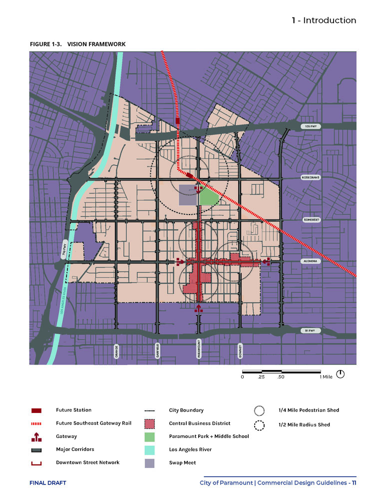 Gruen Associates is pleased to announce that the City of Paramount has approved the new Commercial Design Guidelines completed by our team to enhance the city’s urban landscape. The update replaces the Central Business District Architectural Guidelines adopted in 1984 and establishes a framework for building design, landscaping, screening, lighting, and streetscape elements in commercial areas. Developed in collaboration with the City, the guidelines reflect community outreach through local committees, an open house, and market engagement. They strengthen downtown’s historic character, improve walkability, increase tree planting, incorporate public art, maintain building height limits, and allow greater flexibility in architectural styles and colors. The update also clarifies expectations for private-property landscaping and addresses details such as trash enclosures, screening, lighting, and vacant properties. By promoting walkable, accessible, and well-connected commercial environments with more street-facing dining and retail, the guidelines support existing and future businesses. Final adoption is scheduled for January 13, 2026. Gruen Associates is proud to support Paramount as it builds upon its unique identity for residents, visitors, and business owners alike.