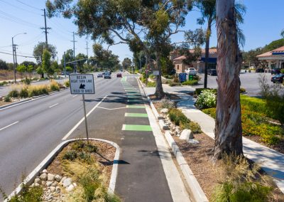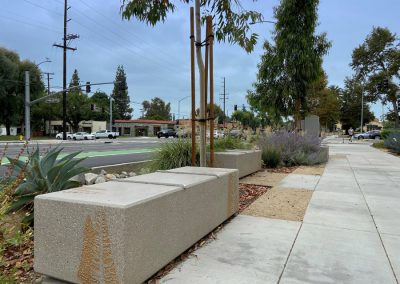 This project implemented a variety of improvements that incorporated “Green Streets” design philosophy into the Foothill Boulevard corridor. The Green Streets philosophy includes strategies for managing stormwater that emphasizes the use of small-scale drainage features integrated throughout the corridor to slow, capture, and filter urban runoff and precipitation. This seeks to reduce water pollution and replenish local aquifers. Also, a major part of the project was to create habitat for native pollinators by expanding the landscape into the medians, parkways, and bike medians. Claremont refers to itself as the “City of Trees”, so an increased tree canopy along the roadway was paramount for the corridor aesthetics, reducing heat island effect and to provide shade for users in the large paved areas. Incorporating existing trees was a goal for the design as well as identifying trees that should be removed to assure the long-term viability of the urban forest canopy along Foothill Boulevard.